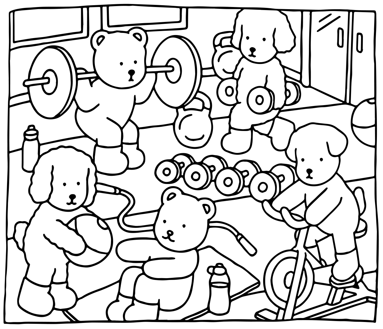 Esta incrível página para colorir apresenta a cena mais fofa que você já viu: uma academia cheia de ursos e cachorrinhos no estilo Desenho Kawaii! Cada um está focado em sua atividade física, mostrando como é divertido e importante se manter saudável e forte. Esta cena é um desenho para colorir fácil e inspirador, perfeito para conversar sobre bons hábitos enquanto você pinta.