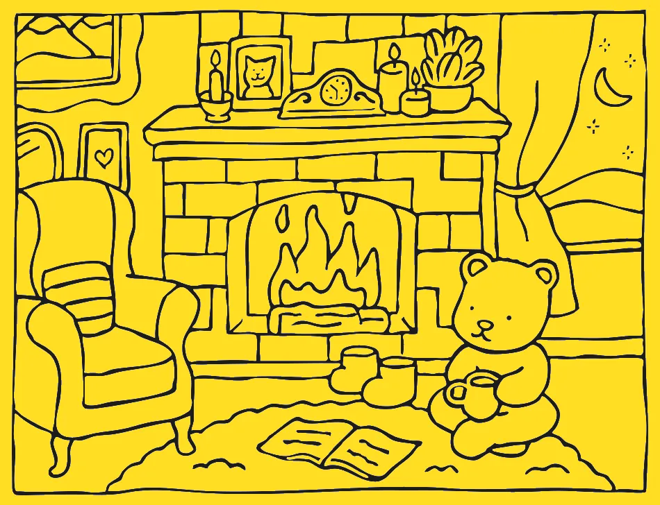 Você está vendo uma obra de arte publicada em nossa galeria! Este desenho foi colorido por uma pessoa com a ferramenta de colorir online do Mundo dos Jogos, a partir do desenho original Desenho para Colorir: Aconchego na Lareira com Bobbie Goods.