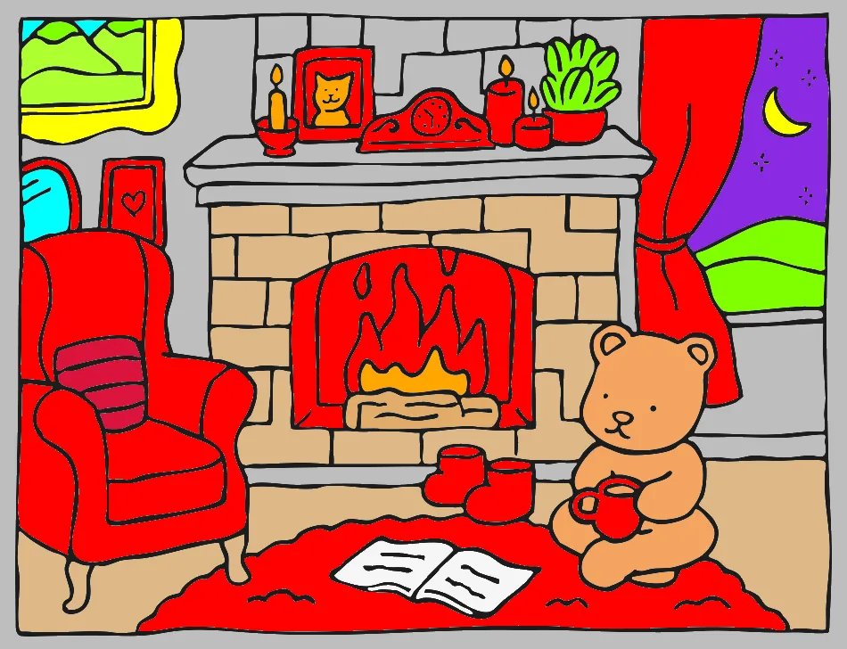 Você está vendo uma obra de arte publicada em nossa galeria! Este desenho foi colorido por uma pessoa com a ferramenta de colorir online do Mundo dos Jogos, a partir do desenho original Desenho para Colorir: Aconchego na Lareira com Bobbie Goods.